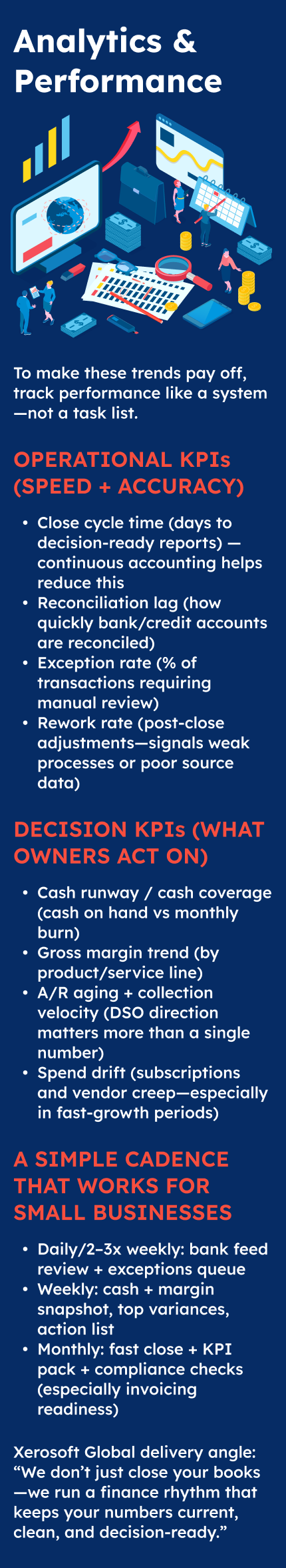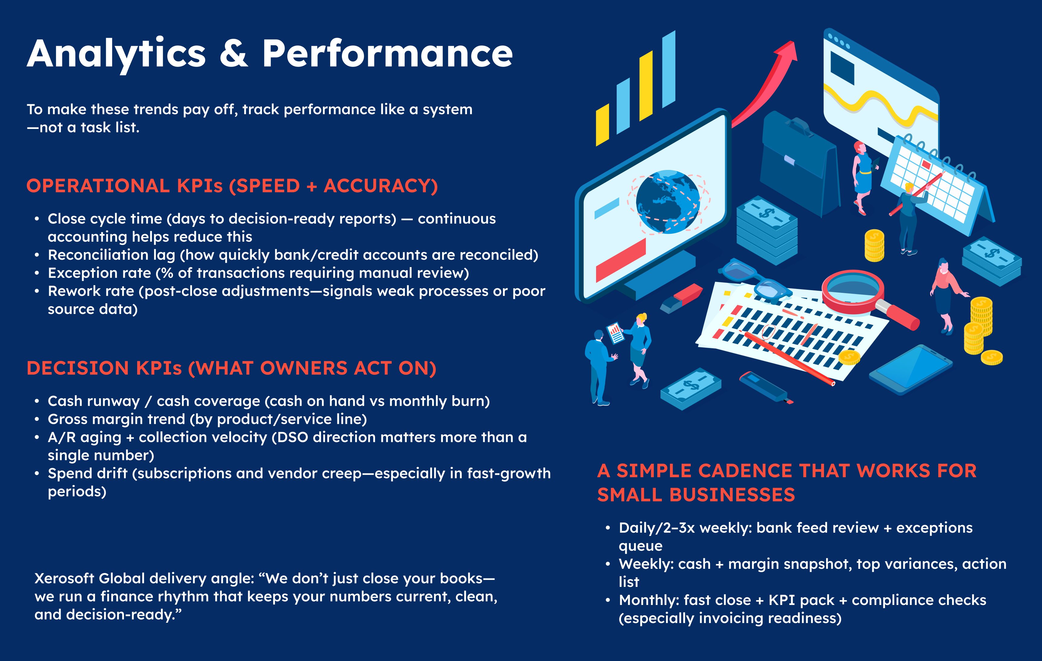 Where Xerosoft Global fits: Xerosoft Global can position bookkeeping as an operating system—real-time close routines, automated workflows with controls, and a monthly KPI pack that leadership actually uses.