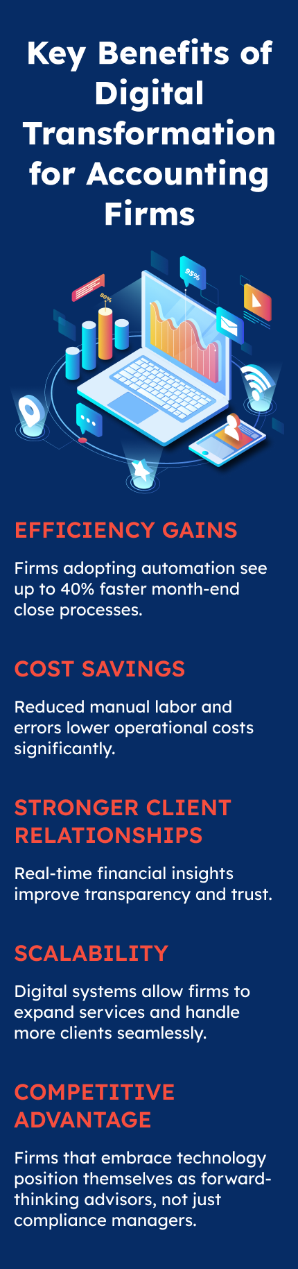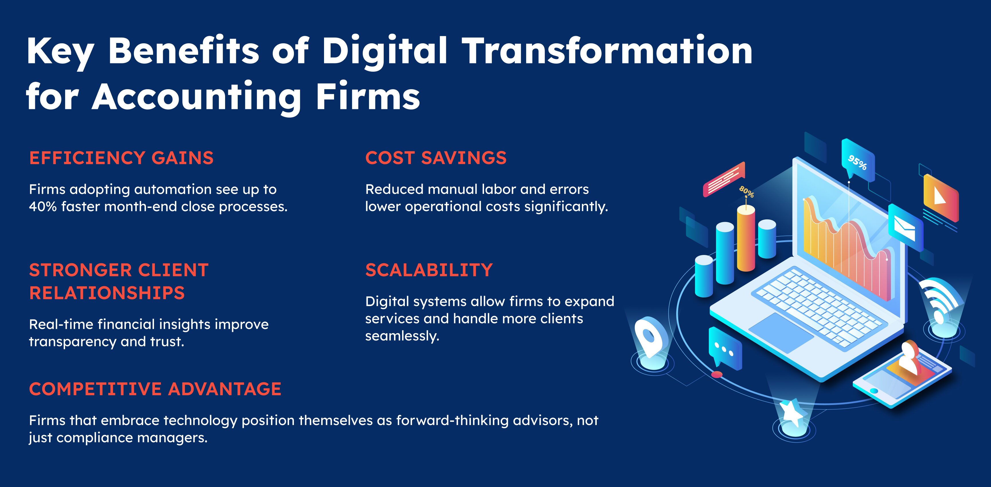 Digitalization isn’t just about replacing old systems—it’s about reimagining how accounting firms deliver value. From AI-powered bookkeeping to client portals that provide real-time insights, the digital-first approach enhances both productivity and customer satisfaction.