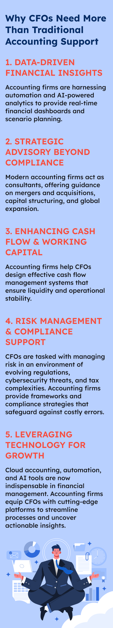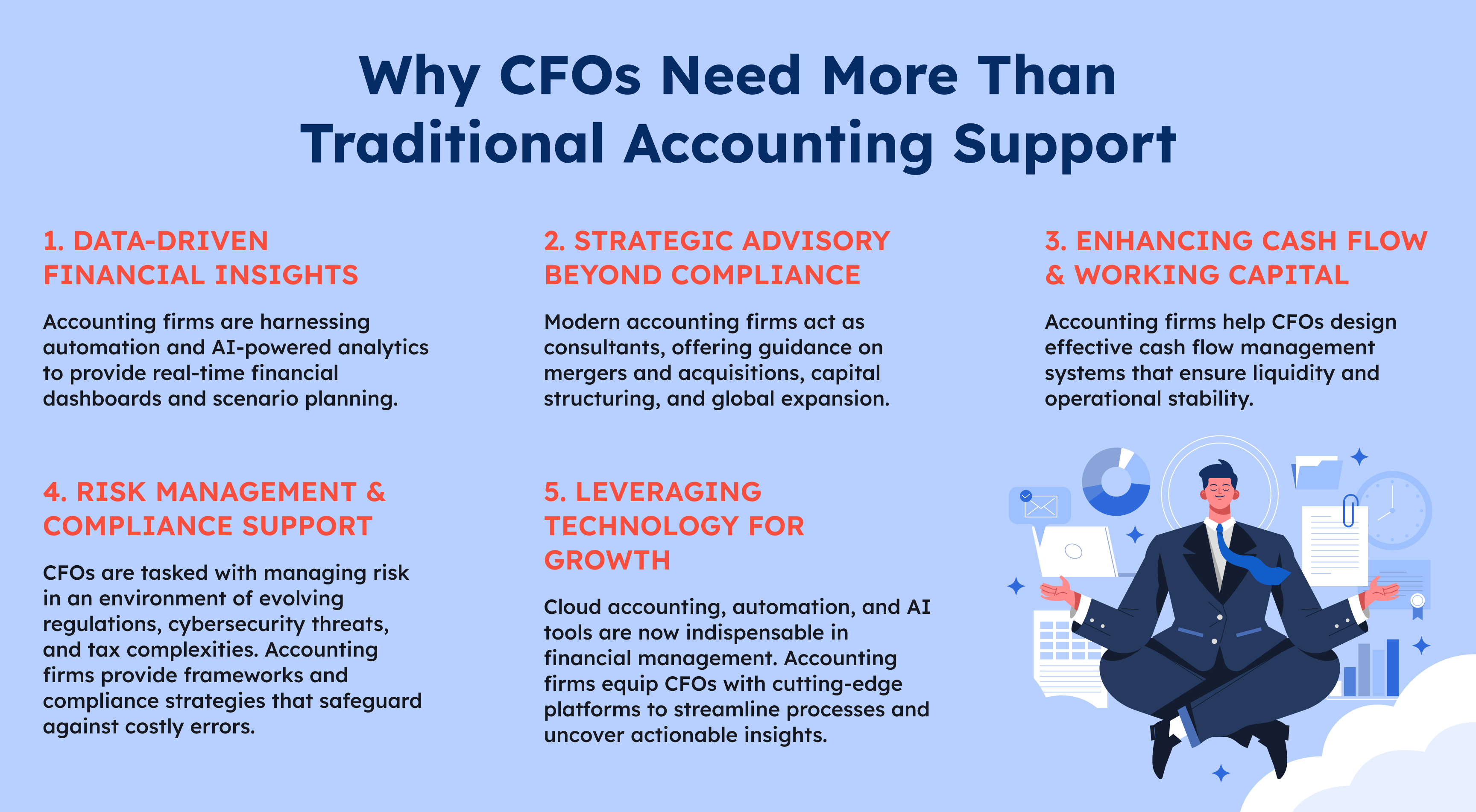 Key Benefit: By leveraging accounting firms, CFOs minimize risk exposure and protect business continuity.