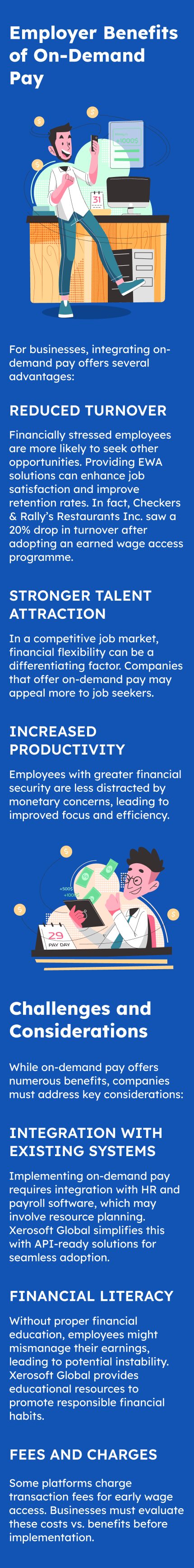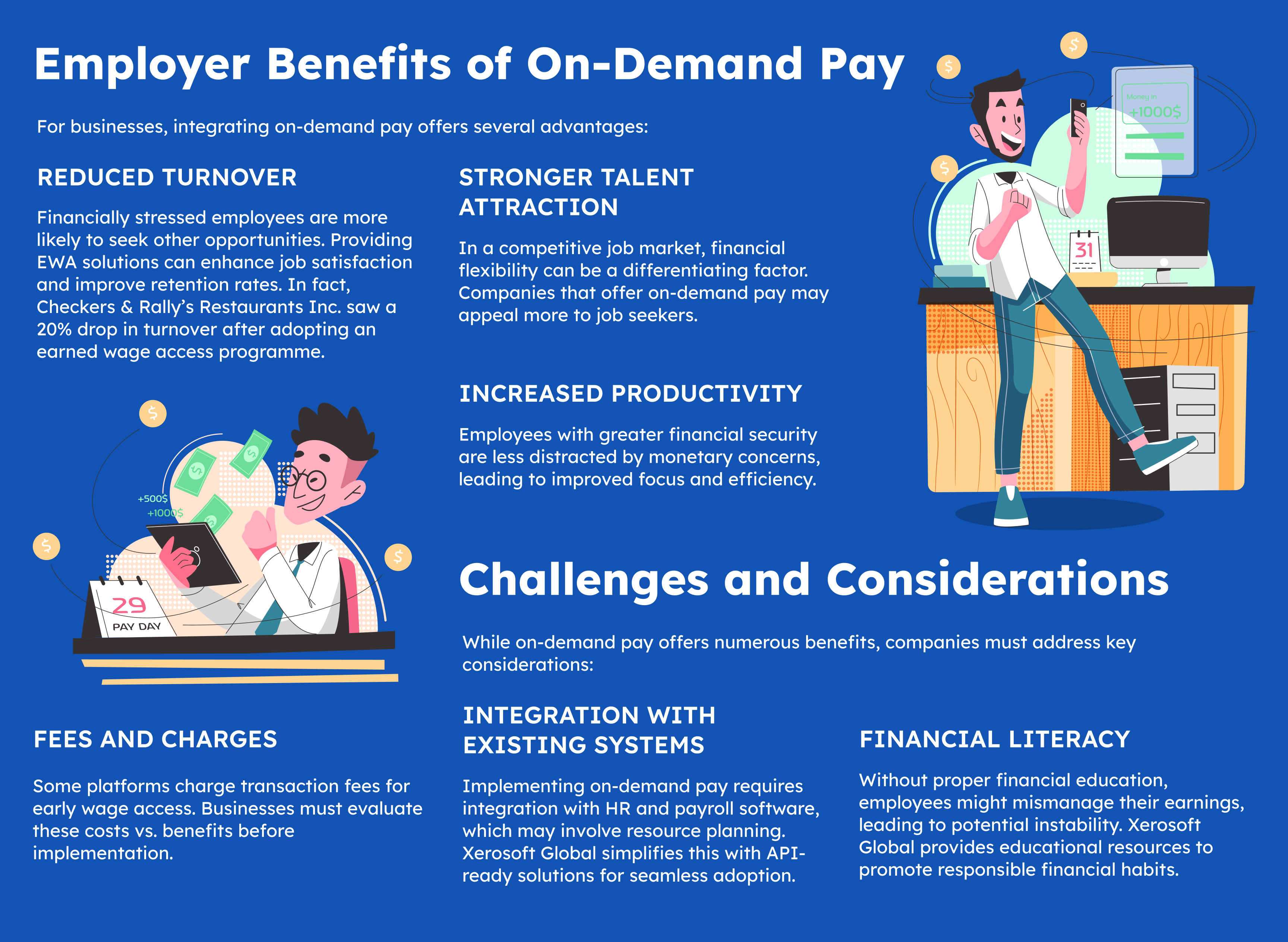 Implementing on-demand pay requires integration with HR and payroll software, which may involve resource planning. Xerosoft Global simplifies this with API-ready solutions for seamless adoption.