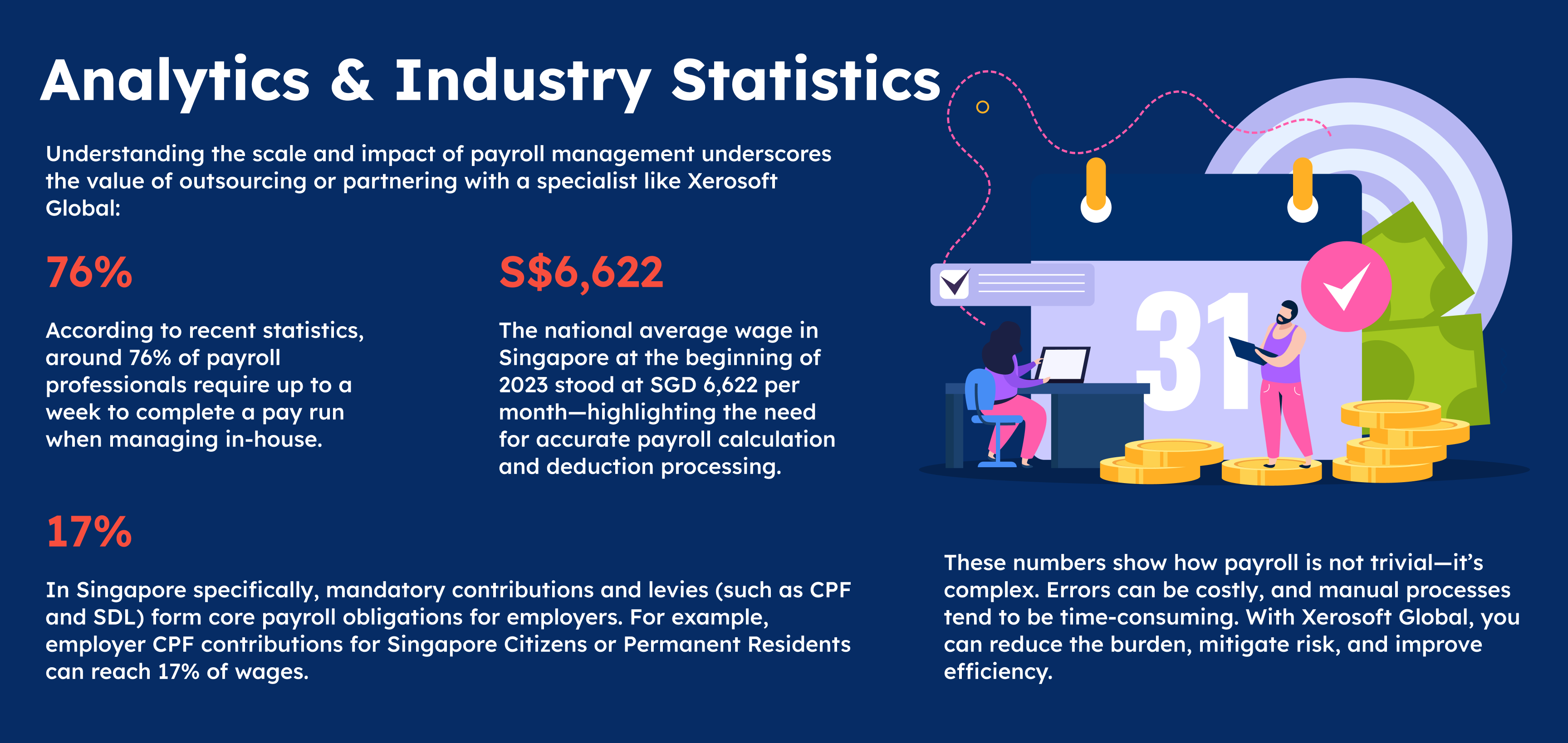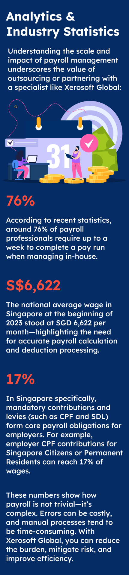 When it comes to managing your business in Singapore, payroll is more than just paying salaries—it’s a critical process that needs to be accurate, efficient, and fully compliant. That’s where Xerosoft Global steps in. Their tailored payroll services bring you peace of mind and free up your team to focus on growth.