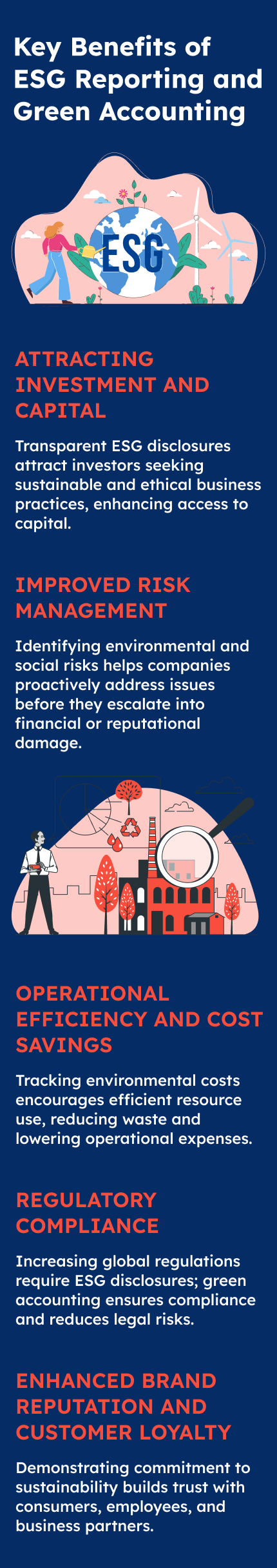 Increasing global regulations require ESG disclosures; green accounting ensures compliance and reduces legal risks.
