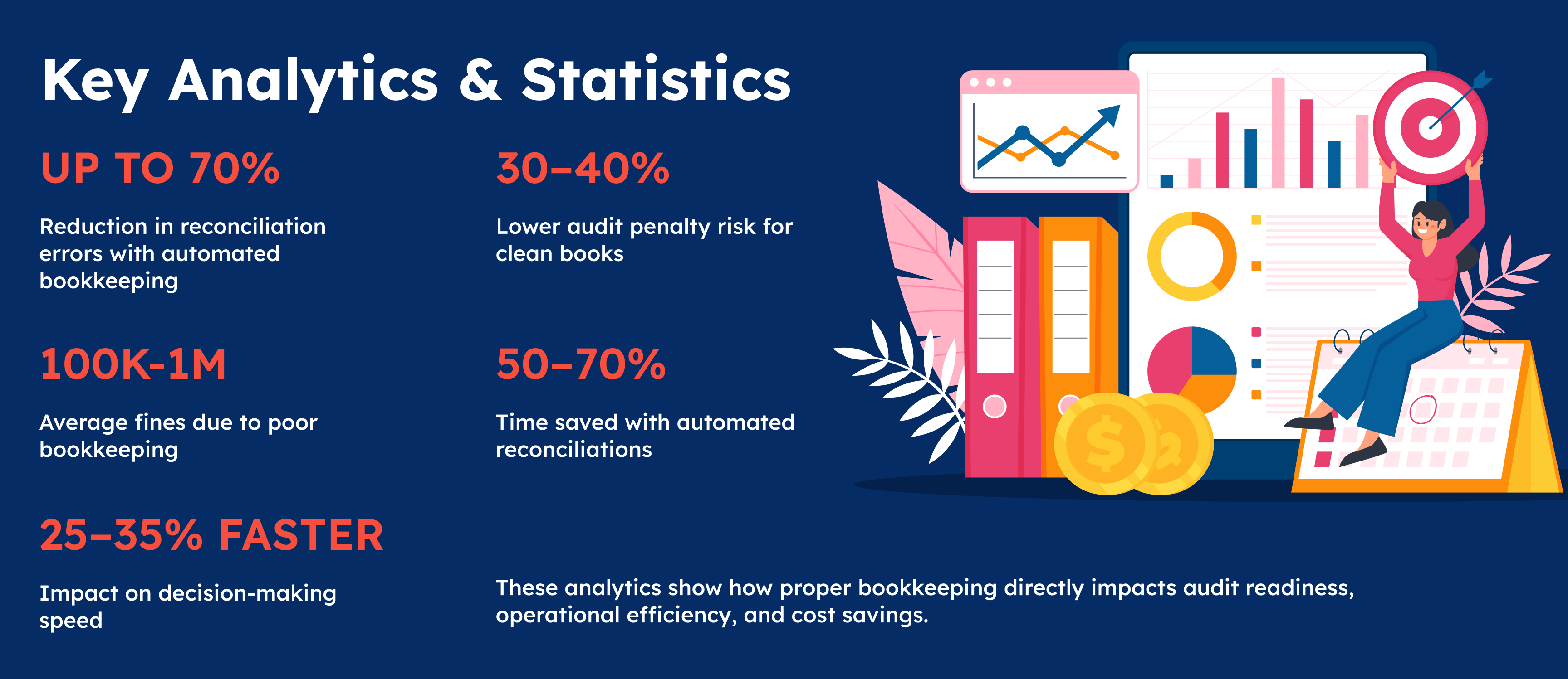 - Businesses with automated bookkeeping can reconcile accounts in 50–70% less time than manual processes